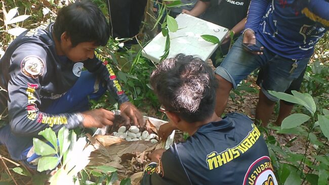 จึงได้เข้าทำการจับงูจงอางหวงไข่ที่แสดงความดุร้ายชูคอแผ่แม่เบี้ยสูงกว่าเอว เตรียมฉก และฉก ด้วยความดุร้าย แต่เจ้าหน้าที่ได้ใช้ความระมัดระวังจึงสามารถจับแม่งูจงอางที่ดุร้ายเอาไว้ได้ นำมาวัดได้ความยาว 3.50 เมตร จึงนำใส่กระสอบ ก่อนเข้ารื้อรังงูและเก็บไข่จงอางนับได้จำนวน 44 ฟอง นำไปเก็บรักษาไว้เพื่อรอให้ออกเป็นตัวก่อนนำไปปล่อยคืนสู่ป่าธรรมชาติต่อไป ส่วนแม่งูงจงอาง เจ้าหน้าที่ได้นำไปปล่อยคืนสู่ป่าธรรมชาติก่อนแล้วเพื่อความปลอดภัย