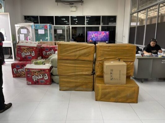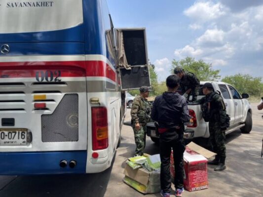 จนกระทั่งพบรถทัวร์โดยสารมาจอด เจ้าหน้าที่จึงได้เข้าตรวจสอบ ที่บริเวณเก็บสัมภาระ พบสินค้าหลายรายการบรรจุในกล่อง และถุงพลาสติก ประกอบด้วย บุหรี่ไฟฟ้า ยี่ห้อ MARBO จำนวน 21 ลัง ตรวจนับได้ประมาณ 4,200 ชิ้น , เสื้อกันฝนต่างประเทศ จำนวน 10 กระสอบ ขนมยี่ห้อ POPPITS จำนวน 10 ลังสอบถามเบื้องต้น นายสมบัติ โครตสงคราม บอกว่า สินค้าดังกล่าวตนเองไม่ทราบว่าเป็นของใคร และไม่ทราบว่าข้างในกล่องเป็นอะไร ตนแค่นำสินค้าไปยังที่สถานี บขส.มุกดาหาร จะมีคนโทรมาบอกว่าจะมีคนเอาสินค้า ส่วนรถโดยสารคันดังกล่าว ตนเองเป็นผู้รับจ้างขับจากนั้นเจ้าหน้าที่ได้ควบคุมตัว พร้อมด้วยสินค้าดังกล่าว มาที่ด่านศุลกากรเพื่อทำการตรวจนับโดยละเอียดอีกครั้ง และได้แจ้งข้อกล่าวหา ก่อนนำตัวเพื่อไปดำเนินคดีตามกฏหมายต่อไป