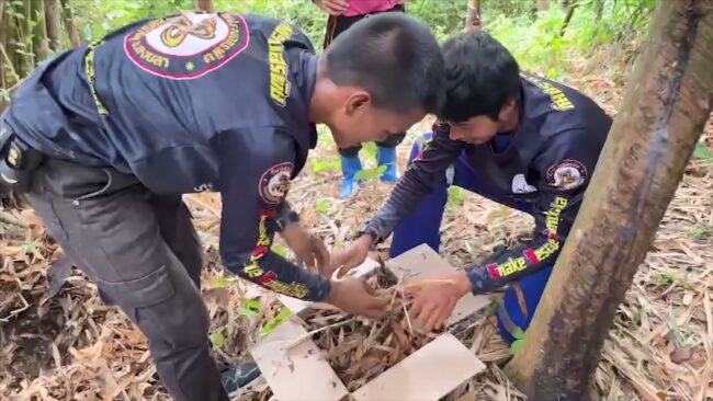 ฤดูจงอางวางไข่ ดุร้าย ฉกใส่มือปราบงู เกือบถึงหน้าอกวันนี้ 4 พฤษภาคม 2568 นายทวีศักดิ์ บุญเศษ , นาย อภิชาติ พรหมสงค์ ,ว่าที่ ร.ต. ไกรวิชญ์ อ่อนมนิล เจ้าหน้าที่ทีมปราบอสรพิษอาสาพิทักษ์งู จ.สงขลา ได้รับแจ้งจากนายสุทธิศักดิ์ แซ่อึ้ง อายุ 46 ปี อยู่บ้านเลขที่ 76 ม.17 ต.นาทวี อ.นาทวี จ.สงขลา ว่ามีงูจงอางมาทำรังและฟักไข่ อยู่ในกอไผ่ในสวนยาง ขอให้ทีมปราบอสรพิษอาสาพิทักษ์งู จ.สงขลา มาช่วยจับงูจงอางให้ด้วย เพราะชาวบ้านในละแวดนั้นต่างผวา เนื่องจากงูวางไข่มีอาการดุร้ายมาก