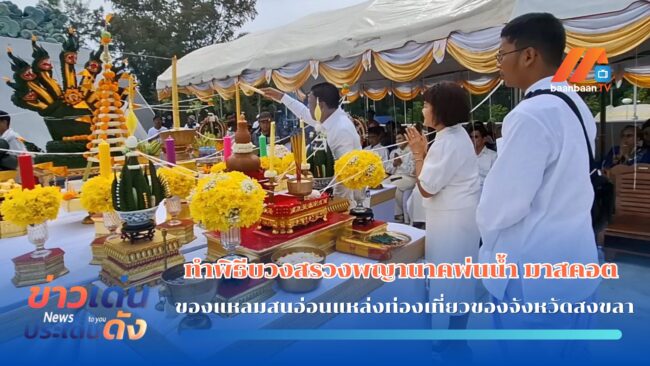 เทศบาลนครสงขลา ทำพิธีบวงสรวงพญานาคพ่นน้ำ มาสคอตของแหลมสนอ่อนแหล่งท่องเที่ยวของจังหวัดสงขลา เพื่อความเป็นสิริมงคลแก่เมืองสงขลา หลังได้ทำการก่อสร้างปรับปรุงเสร็จเรียบร้อยแล้ว โดยมีประชาชน เข้าร่วมพิธีเป็นจำนวนมากวันนี้ 4 พฤษภาคม 2568 เวลา 9:30 น ที่บริเวณลานพญานาคพ่นน้ำ ปลายแหลมสนอ่อน เขตเทศบาลนครสงขลา อำเภอเมือง จังหวัดสงขลา ทางเทศบาลนครสงขลา ได้จัดพิธีบวงสรวงพญานาคพ่นน้ำ มาสคอตของแหลมสนอ่อนแหล่งท่องเที่ยวของจังหวัดสงขลา เพื่อความเป็นสิริมงคลแก่เมืองสงขลา หลังปิดพื้นที่มานานเกือบ 6 ปี ขณะนี้ได้ทำการ ก่อสร้างปรับปรุงพื้นที่เสร็จเรียบร้อยแล้ว จึงได้ทำการจัดพิธีบวงสรวงพญานาคพ่นน้ำขึ้นในวันนี้ โดยมี นายโชตินรินทร์ เกิดสม ผู้ว่าราชการจังหวัดสงขลา เป็นประธานในพิธี มีนายวันชัย ปริญญาศิริ นายกเทศมนตรีนครสงขลา คณะผู้บริหาร เทศบาลนครสงขลา หัวหน้าส่วนราชการและประชาชนชาวสงขลา เข้าร่วมพิธีเป็นจำนวนมาก