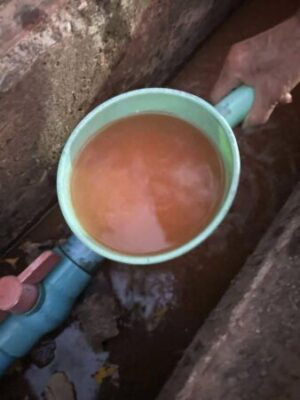 จุดที่ 1 เป็นระบบน้ำประปาหลักของหมู่บ้าน ซึ่งมีชาวบ้านใช้ประมาณ 100 ครัวเรือน ไม่พบปัญหาแต่อย่างใด ส่วนจุดที่ 2 เป็นระบบน้ำประปาจุดที่พบปัญหามีชาวบ้านใช้ไม่น้อยกว่า 40 ครัวเรือน สาเหตุที่น้ำประปามีสีดังกล่าว เนื่องจากระบบน้ำประปาบาดาล ใช้มานานมากแล้ว ระบบกรองน้ำมีการเสื่อมสภาพ และบ่อบาดาลมีความลึกเพียง 6 เมตร ประกอบกับไม่ได้มีได้มีการเป่าล้างบ่อมาเป็นระยะเวลา 2 ปีแล้ว