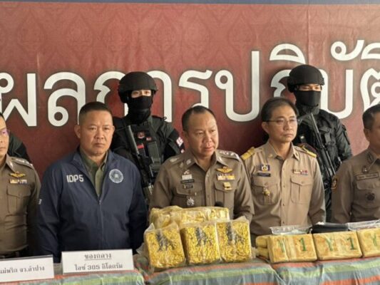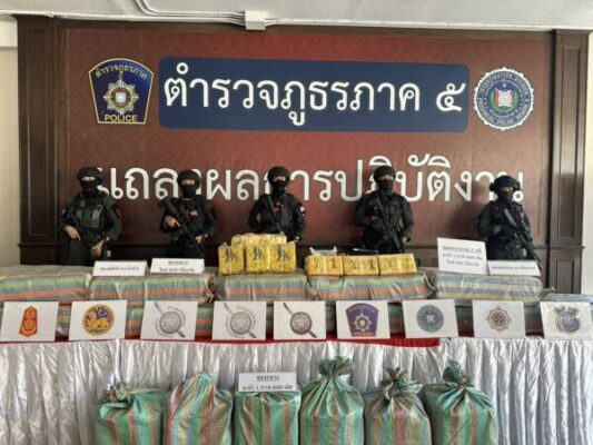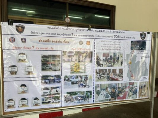 ในส่วนของ สภ.แม่พริก จ.ลำปาง เมื่อเวลา 06.30 น.วันที่ 5 พ.ค.ที่ผ่านมา ตำรวจด่านตรวจยาเสพติด สภ.แม่พริก ได้จับกุมผู้ต้องหา 7 ราย ได้แก่ นายชวลิต นายธนวินท์ นายสมศักดิ์ นายณัฐวุฒิ น.ส.ธมลวรรณ นายอนุวัตและนายธนกฤต ของกลางรถยนต์ 2 คัน ยาเสพติดให้โทษประเภท 1(เมทแอมเฟตามีนไฮโดรคลอไรด์หรือไอซ์) 13 กระสอบ รวมน้ำหนัก 305 กก.ทั้งนี้ก่อนเกิดเหตุ ตำรวจชุดจับกุม ได้ทำการตั้งด่านตรวจ ต่อมาเวลา 02.10 น.วันที่ 5 พ.ค.2568 มีรถยนต์ ยี่ห้อ HONDA ทะเบียน วร 244 กทม.ขับเข้ามายังด่านตรวจมีนายณัฐวุฒิ เป็นคนขับ น.ส.ธมลวรรณ นายอนุวัต นายธนกฤต เป็นผู้โดยสาร สอบถามทราบว่าไปเที่ยวที่ภูชี้ฟ้า จ.เชียงราย มากำลังจะกลับบ้าน ได้ตรวจสอบเบื้องต้นในรถไม่พบสิ่งของผิดกฎหมาย