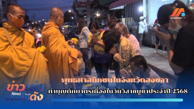 พุทธศาสนิกชนในจังหวัดสงขลา ทำบุญตักบาตรเนื่องในวันวิสาขบูชา ซึ่งเป็นวันสำคัญทางพระพุทธศาสนา และวันสำคัญสากลของโลก ประจำปี 2568วันนี้ 11 พฤษภาคม 2568 ที่ ย่านการค้าวชิรา ถนนทะเลหลวง อ.เมือง จ.สงขลา พุทธศาสนิกชนชาวสงขลา พาครอบครัวนำ อาหาร คาวหวาน ทำบุญตักบาตรพระสงฆ์เนื่องในวันวิสาขบูชา ซึ่งเป็นวันสำคัญทางพระพุทธศาสนา และวันสำคัญสากลของโลก เพื่อความเป็นสิริมงคลแก่ตนเองและครอบครัววันวิสาขบูชา เป็นวันที่สมเด็จพระสัมมาสัมพุทธเจ้า ประสูติ ตรัสรู้ และปรินิพพาน ซึ่งเกิดขึ้นในวันและเดือนเดียวกัน คือ ในวันเพ็ญขึ้น 15 ค่ำ เดือน 6 เพื่อน้อมรำลึกถึงพระวิสุทธิคุณ พระปัญญาคุณ และพระมหากรุณาธิคุณ ของพระสัมมาสัมพุทธเจ้าที่มีต่อมวลมนุษย์และสรรพสัตว์ อีกทั้งเพื่อเป็นการรำลึกถึงเหตุการณ์อันน่าอัศจรรย์ทั้ง 3 ประการ ที่มาบังเกิดในวันเดียวกัน