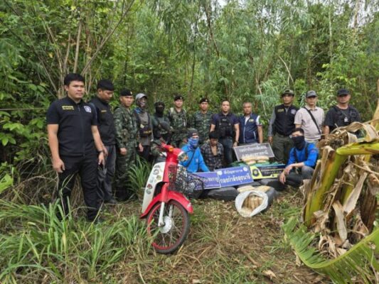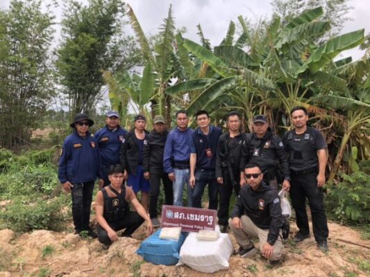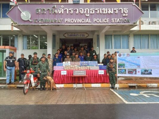 ที่ สภ.เขมราฐ จ.อุบลราชธานี พ.ต.อ.สานิตย์ ไชยสถิตย์รองผบก.ภ.จว.ยโสธร ช่วยราชการ ภ.จว.อุบลราชธานี พ.ต.อ.ชาญชัย อินนรา ผกก.สส.ภ.จว.อุบลราชธานี พ.ต.อ.อดุลย์ สุรำไพ ผกก.สภ.เขมราฐ พร้อมด้วย พ.อ.ปภังกร หมื่นสา ผบ.ทก.กกล.สุรนารี พ.อ.วุฒิชัย ยศพิทักษ์ รอง ผบ.ทก.กกล.สุรนารี น.อ.ชชนน อิทธิภูรินท์ ผบ.นรข.อุบลราชธานี นายนัฐพงศ์ รุ่งธนศักดิ์ นายอำเภอเขมราฐ ชุดสืบสวน 2 สภ.เขมราฐ กก.ตชด.22 ศป.ปส.ร้อย ตชด.227 ตม.จว.อุบลราชธานี ตำรวจน้ำเขมราฐ ชุด นฝด.22 กกล.สุรนารี ชุดสุนัขที่ 7 กกล.สุรนารี ชุดชป.502 (นปพ.ทอ.) ชุด มว.ลว.ไกลที่ 1 ร่วมแถลงข่าวการจับกุม นายเกรียงไกร อายุ 40 ปี พร้อมของกลาง ยาบ้า 5 กระสอบ จำนวน 1,000,000 เม็ด และรถจักรยานยนต์ยี่ห้อฮอนด้า สีแดง หมายเลขทะเบียน 1 กย 4745 อุบลราชธานี