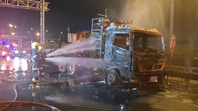 ในที่เกิดเหตุพบรถบรรทุกพ่วง 18 ล้อ ไม่ทราบรุ่นและสี ทะเบียน หัวลาก 70-8330 สระบุรี หางพ่วง 70-3001 สระบุรี จอดอยู่ข้าง โดยมีไฟกำลังลุกไหม้ที่ห้องโดยสาร และถังก๊าซ NGV ขนาดใหญ่จำนวน 8 ถัง ที่ติดตั้งอยู่ด้านหลังห้องดโดยสาร เนื่องจากมีการรั่วไหลของก๊าซ NGV จนทำให้เกิดแสงเพลิงลุกไหม้อย่างรุนแรง ท่ามกลางสายตาของประชาชนที่ขับรถยนต์ผ่านทางจำนวนมาก เจ้าหน้าที่กู้ภัยและดับเพลิงต้องปิดกั้นการจราจรบางช่องทาง เพื่อความปลอดภัยและระดมรถดับเพลิงและนักดับเพลิงหลายนาย เข้าฉีดน้ำสกัดเพลิง ใช้เวลาประมาณ 30 นาที เพลิงจึงสงบ โดยจากการตรวจสอบเบื้องต้นพบว่ารถถูกไฟเพลิงเผาไหม้เสียหายทั้งคัน