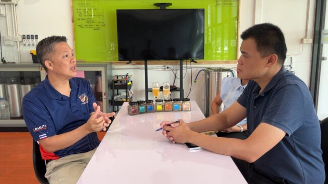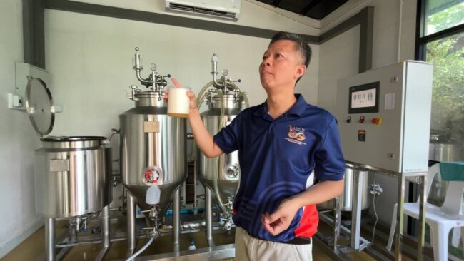 ดร.ภูชิสส์ ตันวาณิชกุล อาจารย์ประจำสาขาวิศวกรรมอาหารและชีวภาพ คณะวิศวกรรมศาสตร์ มทร.อีสาน วิทยาเขตขอนแก่น กำลังตรวจสอบขั้นตอนและกระบวนการวิธีการหมักเครื่องดื่มตะวันตก ตามแผนการจัดการเรียนการสอน ด้วยการตรวจสอบการตกตะกอนของกระบวนการหมักข้าวบาร์เลย์ และการทดสอบฟองและรสชาติของเครื่องดื่มตามห้วงเวลาของการผลิตเครื่องดื่มที่กำหนด