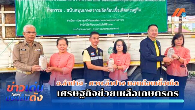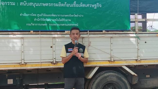 เมื่อวันที่ 23 พ.ค.2568 ที่ จ.ลำปาง ผู้สื่อข่าวรายงานว่า ณ ที่ทำการวิสาหกิจชุมชนเกษตรปลอดภัยทองทิพย์ บ้านจำ(สวนมรกต)ต.ปงยางคก อ.ห้างฉัตร นายสุริยนต์ ดีดเหล็ก ผอ.ศูนย์วิจัยและพัฒนาการเกษตรลำปาง (ศวพ.ลำปาง)จัดกิจกรรมมอบก้อนเชื้อเห็ดเศรษฐกิจให้แก่เกษตรกร จำนวน 23 ราย ภายใต้โครงการสกัดการระบาดของโรคแมลงศัตรูพืช เชื้อรา และการสนับสนุนพันธุ์พืชและปัจจัยการผลิต เพื่อช่วยเหลือเกษตรกรที่ประสบภัยพิบัติ ปี 2567/2568 เมื่อวันที่ผ่านมา และการซ่อมแซมและฟื้นฟูเครื่องจักรกลเกษตรขนาดเล็กหลังน้ำท่วมเพื่อบรรเทาความเดือดร้อน และสนับสนุนการฟื้นฟูอาชีพของเกษตรกร ที่ได้รับผลกระทบจากภัยพิบัติ พร้อมส่งเสริมให้เกษตรกรสามารถนำก้อนเชื้อเห็ดไปใช้ผลิตเห็ดเศรษฐกิจเพื่อบริโภคและสร้างรายได้เสริมในครัวเรือน
