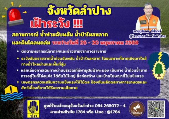 ลำปาง- เฝ้าระวังสถานการณ์ น้ำท่วมฉับพลัน น้ำป่าไหลหลากและดินโคลนถล่มในช่วงวันที่ 26-30 พ.ค.นี้เมื่อวันที่ 25 พ.ค.2568 ที่ จ.ลำปาง ผู้สื่อข่าวรายงานว่า จังหวัดลำปาง ประกาศเตือนภัย เฝ้าระวัง น้ำท่วมขัง น้ำท่วมฉับพลัน น้ำป่าไหลหลาก และดินโคลนถล่ม ในช่วงวันที่ 26-30 พ.ค.2568 นี้ ให้ทุกหน่วยงานเตรียมพร้อมรับมือสถานการณ์ฝนตกหนักและหน่วยงานที่เกี่ยวข้อง เตรียมพร้อมเฝ้าระวังและติดตามสถานการณ์อย่างใกล้ชิด ทั้งนี้จากการติดตามพยากรณ์อากาศพบว่ายังมีฝนตกหนักถึงหนักมากบางพื้นที่ในพื้นที่ จ.ลำปาง ได้แก่ อ.เมืองลำปาง และอ.ห้างฉัตร ให้เฝ้าระวังหากเกิดเหตุสาธารณภัย และส่งผลให้เกิดความเสียหายต่อชีวิตและทรัพย์สินในพื้นที่ใดให้เร่งดำเนินการให้ความช่วยเหลือผู้ประสบภัย เข้าสำรวจความเสียหายโดยเร็ว พร้อมทั้งเตรียมเครื่องจักร เครื่องมือ บุคลากร และระบบสื่อสาร ประชาสัมพันธ์และแจ้งเตือนประชาชนในพื้นที่เสี่ยงให้อพยพหรือย้ายของขึ้นที่สูงได้ทันเวลา