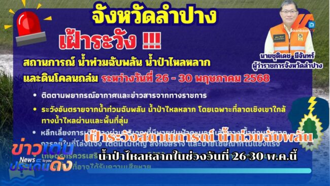 ลำปาง- เฝ้าระวังสถานการณ์ น้ำท่วมฉับพลัน น้ำป่าไหลหลากและดินโคลนถล่มในช่วงวันที่ 26-30 พ.ค.นี้เมื่อวันที่ 25 พ.ค.2568 ที่ จ.ลำปาง ผู้สื่อข่าวรายงานว่า จังหวัดลำปาง ประกาศเตือนภัย เฝ้าระวัง น้ำท่วมขัง น้ำท่วมฉับพลัน น้ำป่าไหลหลาก และดินโคลนถล่ม ในช่วงวันที่ 26-30 พ.ค.2568 นี้ ให้ทุกหน่วยงานเตรียมพร้อมรับมือสถานการณ์ฝนตกหนักและหน่วยงานที่เกี่ยวข้อง เตรียมพร้อมเฝ้าระวังและติดตามสถานการณ์อย่างใกล้ชิด ทั้งนี้จากการติดตามพยากรณ์อากาศพบว่ายังมีฝนตกหนักถึงหนักมากบางพื้นที่ในพื้นที่ จ.ลำปาง ได้แก่ อ.เมืองลำปาง และอ.ห้างฉัตร ให้เฝ้าระวังหากเกิดเหตุสาธารณภัย และส่งผลให้เกิดความเสียหายต่อชีวิตและทรัพย์สินในพื้นที่ใดให้เร่งดำเนินการให้ความช่วยเหลือผู้ประสบภัย เข้าสำรวจความเสียหายโดยเร็ว พร้อมทั้งเตรียมเครื่องจักร เครื่องมือ บุคลากร และระบบสื่อสาร ประชาสัมพันธ์และแจ้งเตือนประชาชนในพื้นที่เสี่ยงให้อพยพหรือย้ายของขึ้นที่สูงได้ทันเวลา