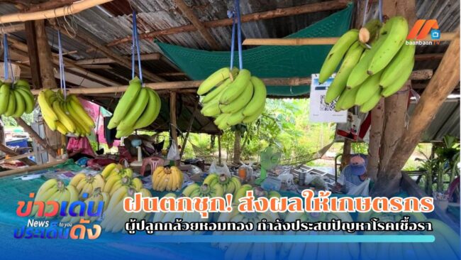 น.ส.อรญา เพชรนาค อายุ 40 ปี อยู่บ้านเลขที่ 76 บ้านนาเพียง ม.4 ต.สำราญ จ.ขอนแก่น เจ้าของสวนกล้วย กล่าวว่า ช่วงนี้ฝนตกบ่อยส่งผลกระทบทำให้น้ำฝนที่ตกลงมาอย่างต่อเนื่องทำให้ดินแฉะส่งผลให้รากของต้นกล้วยเป็นเชื้อรา เริ่มได้รับผลกระทบมาตั้งแต่ช่วงเข้าฤดูฝนที่ผ่านมา ปลูกกล้วยหอมทอง 3 ไร่ ประมาณ 1,200 ต้น “ช่วงนี้กล้วยหอมทองกำลังเป็นราคาแต่ดันมาเจอฝนอาจจะต้องมีการฉีดยากันเชื้อราบ้างในระยะนี้ ถ้าไม่ฉีดกันไว้รากจะเน่าและเปื่อยตายในที่สุด ทำให้มีต้นทุนเพิ่มขึ้นแต่ก็เล็กน้อยประกอบกับ ปีนี้กล้วยราคาดีกว่าปีที่ผ่านมา ซึ่งที่สวนปลูกเองขายเองเริ่มต้นขายหวีละ 70-140 บาทแล้วแต่ขนาดของหวี โดยที่ ปีนี้ลงทุนปลูกกล้วยขาย จึงถือว่าคุ้มค่าที่ลงทุนไป”