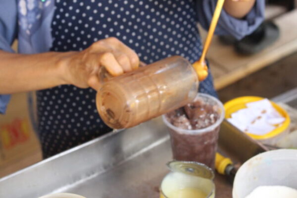 น.ส.บุปผา สามะ หรือที่ลูกค้าเรียกกันติดปากว่า”กะเดะ” บอกว่า ที่ร้านมีเมนูร้อน-เย็น เพียงแก้วละ 15 บาท หากใส่ถุง 20 บาท และยังมีเมนูเครื่องดื่มร้อน แก้วละ 10 -15 บาท นอกจากนี้ยังมีขนมปังปิ้งหลากหลายหน้ารสชาติอร่อยกรอบนอกนุ่มใน ยิ่งทานตอนร้อนๆ ยิ่งฟินมาก ทานกับน้ำชา กาแฟ ที่มีรสชาติเข้มข้นเข้ากันได้ดี เพียงชุดละ 20 บาท ส่วนเมนูขึ้นชื่อของทางร้านจะเป็น ชาเย็น โกโก้เย็น ชาโกโก้เย็น เฉาก๊วยนมสด โดยแต่ละวัน ขายได้กี่แก้วไม่เคยนับ แต่นม ใช้ไป วันละ2 ลัง ลังละ 24 กระป๋อง