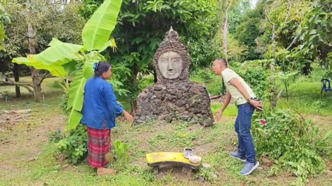 เมื่อวันที่ 29 พ.ค. 2568 ผู้สื่อข่าวเดินทางไปที่สวนแทนคุณแผ่นดิน บ้านซำขี้เหล็ก หมู่ที่ 10 ต.พราน อ.ขุนหาญ จ.ศรีสะเกษ ซึ่งเป็นสวนทุเรียนแห่งแรก และต้นแรกของ อ.ขุนหาญ และจ.ศรีสะเกษ ที่ปลูกเมื่อปี 2529 ปัจจุบันทุเรียนต้นนี้ มีอายุแล้ว 39 ปี ซึ่งเดิมมีชื่อว่า สวนโชคเกษมสุข มีพื้นที่เพาะปลูก 20 ไร่ โดยมีการปลูกทุเรียน พันธุ์หมอนทอง และพื้นที่ว่าระหว่างต้นได้ปลูกมังคุดแซมด้วย ระหว่างผู้สื่อข่าวได้เดินเที่ยวชมสวน ได้สังเกตเห็นพระพุทธรูป ที่มีลักษณะแปลกตา ตั้งอยู่ภายในสวนทุเรียน จำนวน 3 องค์ จึงเดินเข้าไปดูใกล้ๆ ถึงกับอึ้ง พบว่าองค์พระพุทธรูปถูกปั้นขึ้นโดยใช้เศษหิน เศษปูน ประติดประต่อกัน เป็นลวดลายที่สวยงามมาก ซึ่งองค์แรก มีขนาดกว้างประมาณ 1.50 เมตร สูง 1.50 เมตร องค์ที่ 2 กว้าง 2 เมตร สูง 2 เมตร และองค์ที่ 3 อยู่ใต้ต้นโพธิ์ที่เกิดขึ้นเองโดยธรรมชาติ มีขนาดกว้าง 3 เมตร สูง 3 เมตร โดยเฉพาะบริเวณเศียรองค์พระพุทธรูป มีการใช้เศษหินแดงที่อยู่ตามริมถนนบนทางลูกรัง ตั้งเรียงกันขึ้นอย่างงดงาม
