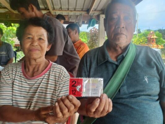 คุณตาวัย70ปีดวงเฮงถูกลอตเตอรี่รางวันที่1 รับโชค 12 ล้านบาท ที่ หมู่ที่ 9 บ้านดงย่าปา ตำบลบ้านตึก อำเภอศรีสัชนาลัย จังหวัดสุโขทัย ญาติพี่-น้องเพื่อนบ้าน พากันมาแสดงความดีใจ กับ นายสำราญ สีคำ อายุ 70 ปี เกษตรกรชาวสวนทุเรียน เป็นผู้โชคดีถูกรางวัลที่ 1 จำนวน 2 ใบ รับโชคก้อนโต 12 ล้านบาท