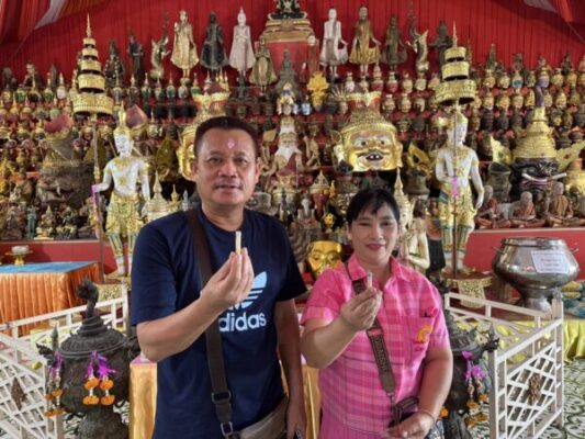 วันที่ 13 มิ.ย.2568 ที่อาศรมฤาษีเณร ธาตุพุทธคุณ ถนนกาญจนาภิเษกวงแหวนตะวันตกหมายเลข 9 มีผู้คนจำนวนมากเดินทางมากกราบไหว้ขอพรสิ่งศักดิ์สิทธิ์ต่างๆภายในอาศรมทั้งถวายพานฟักทองไหว้ปู่ฤาษีพรหมเมศ ถวายพานน้ำแดงไหว้กุมารทองเจ้าสัวเฮง ถวายพานกุหลาบแดงไหว้ท้ายเวสสุวรรณ 9 หน้าสูง 16 เมตร กราบไหว้ขอพร 3 ศาลเจ้าแม่ตะเคียน เจ้าแม่สไบทิพย์ เจ้าแม่ทอง เจ้าแม่สไบเงิน กราบขอพรเจ้าเงาะในถ้ำจินดามณี กราบไหว้พระพิฆเนศวรกายสีแดง แม่กระซิบ เทพทันใจ องค์พญาครุฑในเมืองยักษ์และยังได้เข้าร่วมพิธีกรรมต่างๆกับอาจารย์ฤาษีเณร ธาตุพุทธคุณ ทั้งถวายข้าวสาร ยกพ่อแก่ ปะพรมน้ำมนต์ อาบน้ำมนต์หมื่นวัดและยังได้ส่องเลขอ่างน้ำมนต์บนศาลาบุญช่วยเพื่อนำไปเสี่ยงโชค โดยตัวเลขจะลอยวนจับกันเรียกว่าเทวะบันดาล เลขทั้งหมดได้แก่ 2 3 4 7 8 9