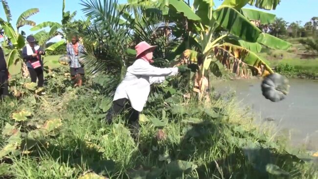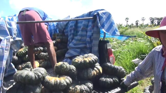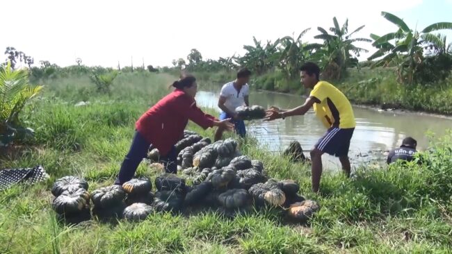 สีสัน ที่แปลงปลูกฟักทองของนางอุบล ส้มตั้น อายุ 58 ปี ที่หมู่ที่ 6 ต.ท่าบอน อ.ระโนด จ.สงขลา ได้ระดมญาติพี่น้องและเพื่อนบ้านมาลงแขกช่วยกันเก็บผลผลิตฟักทองส่งขายให้กับแม่ค้าที่มารับซื้อถึงหน้าแปลงปลูกฟักทอง จำนวน 4.5 ตัน โดยทำการเก็บฟักทองที่ปลูกทั้งสองแปลง ในพื้นที่ 8 ไร่ 1,100 ต้น ในวันนี้เป็นการเก็บรอบแรก โดยน้ำหนักของฟักทองที่เก็บขายในวันนี้ อยู่ที่ 3 – 7 กิโลกรัมต่อผล และทางแม่ค้าจะมาเก็บรอบที่สองอีก 10 วันจำนวน 4.5 ตัน โดยใช้ระยะเวลาในการปลูกฟักทอง 80-90 วัน ก็สามารถเก็บเกี่ยวผลผลิตขายได้