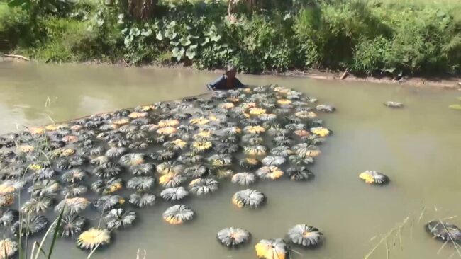 สำหรับการเก็บเกี่ยวผลผลิตฟักทองที่แปลงปลูกฟักทองของนางอุบลฯ จะใช้ภูมิปัญญาชาวบ้านที่ทำกันมาของเกษตรกรในพื้นที่ โดยวิธีโยนฟักทองลงไปในคูน้ำด้านข้างของแปลง เมื่อเก็บได้มากพอประมาณก็ใช้คนลงไปในคูน้ำ 2 คน กับไม้ที่มีความยาวเท่ากับความกว้างของคูน้ำ ช่วยกันต้อนฟักทองที่ลอยอยู่ในน้ำมาขึ้นฝั่งที่รถยนต์กระบะเข้ามาจอดได้ หลังจากนั้นก็ช่วยกันลำเลียงฟักทองจากคูน้ำขึ้นบนรถยนต์ที่แม่ค้านำมาบรรทุกฟักทองเพื่อไปส่งให้กับลูกค้าที่ตลาดในอำเภอระโนดและอำเภอใกล้เคียง.