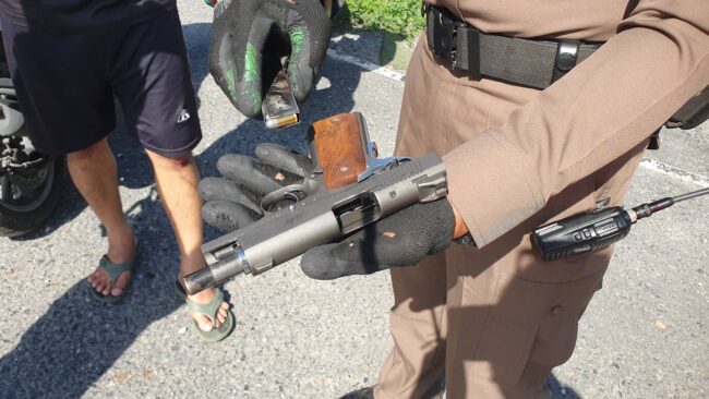 ต่อมามีภาพวงจรปิดกับภาพเห็นตำรวจ หน่วยปฏิบัติการพิเศษภาค 2 ได้มีการกอดรัดฟัดเหวี่ยงกับคนร้ายและมีการชกต่อยกัน ต่อมาได้พบกับ ดต.สมปอง ฟองตา ตำรวจสังกัด ปพ.ภ.2 ที่เกิดเหตุได้รับบาดเจ็บที่ข้อมือขวาและกระสุนปืนถากที่ศรีษะ เปิดเผยว่า ผ่านมาเจอตอนแรกคิดว่าแค่ขโมยของพอมาถึงมันก็ชักปืนใส่เลยจนถึงใช้มือปัดกระสุนเลยถากไปที่หมวกกันน็อคที่สวมใส่ที่ศรีษะแล้วมันหนีไป ตำรวจได้ยึดปืน อาวุธปืนขนาด 9 มม แบบแมกกาซีน พร้อมกระสุนอยู่ในแม็กของคนร้าย เอาไว้ตรวจสอบแล้ว
