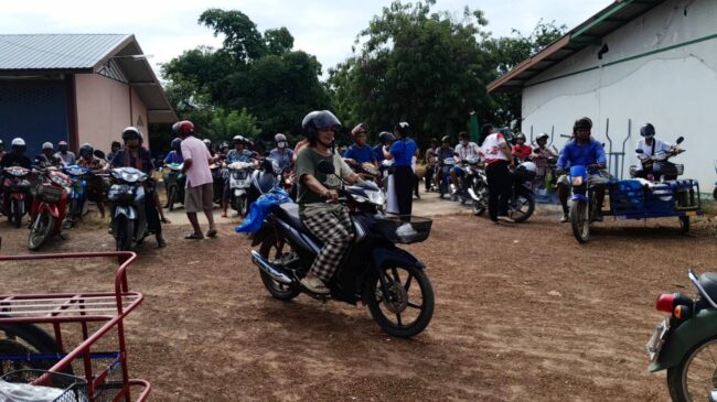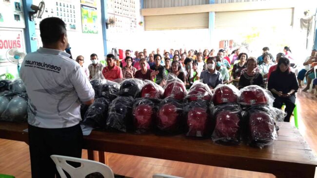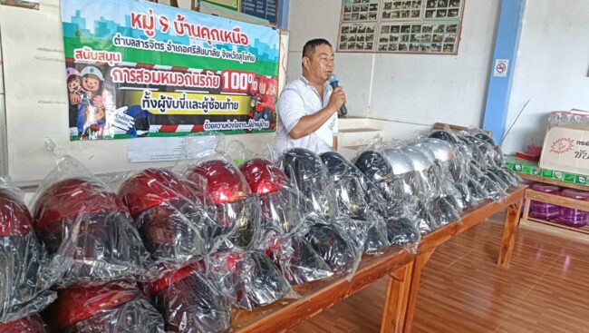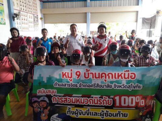 สุโขทัย ผู้ใหญ่บ้านแจกฟรีหมวกกันน๊อคให้กับลูกบ้าน รณรงค์การขับขี่ปลอดภัย สวมหมวกนิรภัยเพื่อลดอุบัติเหตุจราจรทางบก สนับสนุนการสวมหมวกนิรภัย100เปอร์เซ็นต์”.