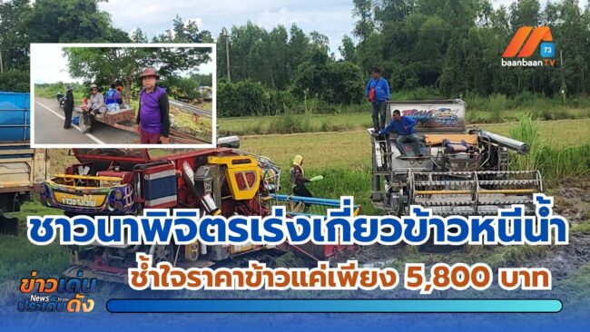จ.พิจิตร :(มีคลิป) ชาวนาลุ่มน้ำยมพิจิตรเร่งเกี่ยวข้าวหนีน้ำท่วม สุดระกำช้ำใจราคาข้าวแค่เพียง 5,800 บาท